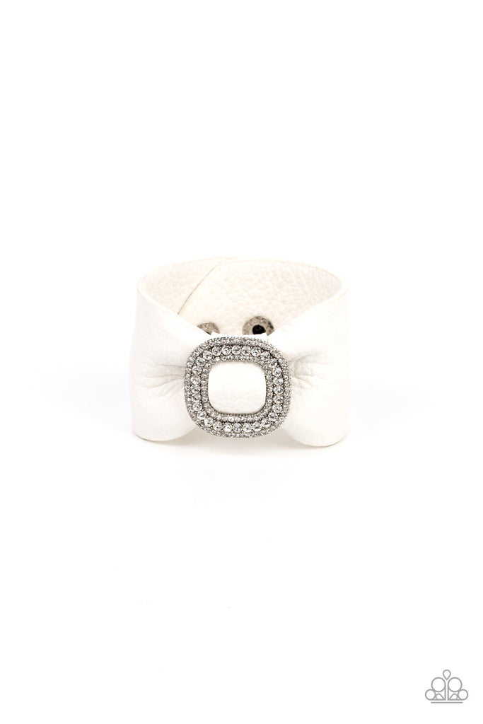 A thick silver pleather band delicately knots around the wrist. Stacked with brilliant silver rhinestones, a dramatic silver buckle sparkles at the center of the wrist for a dramatic finish. Features an adjustable snap closure.