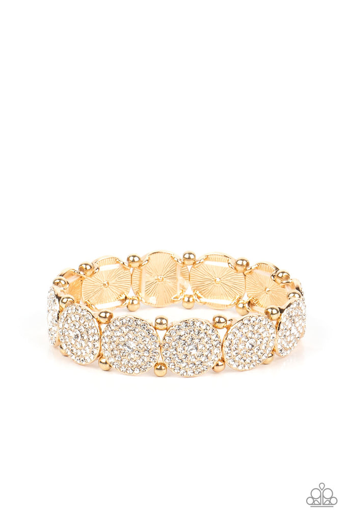 Separated by pairs of gold beads, icy white rhinestone encrusted gold frames glitter along stretchy bands around the wrist for a timeless twinkle.