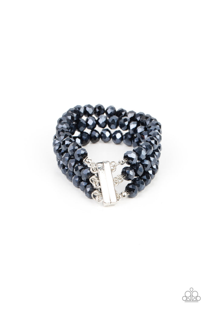 Rows of metallic blue crystal-like beads are threaded along invisible wires around the wrist, layering into a smoldering sparkle. Features a magnetic closure.