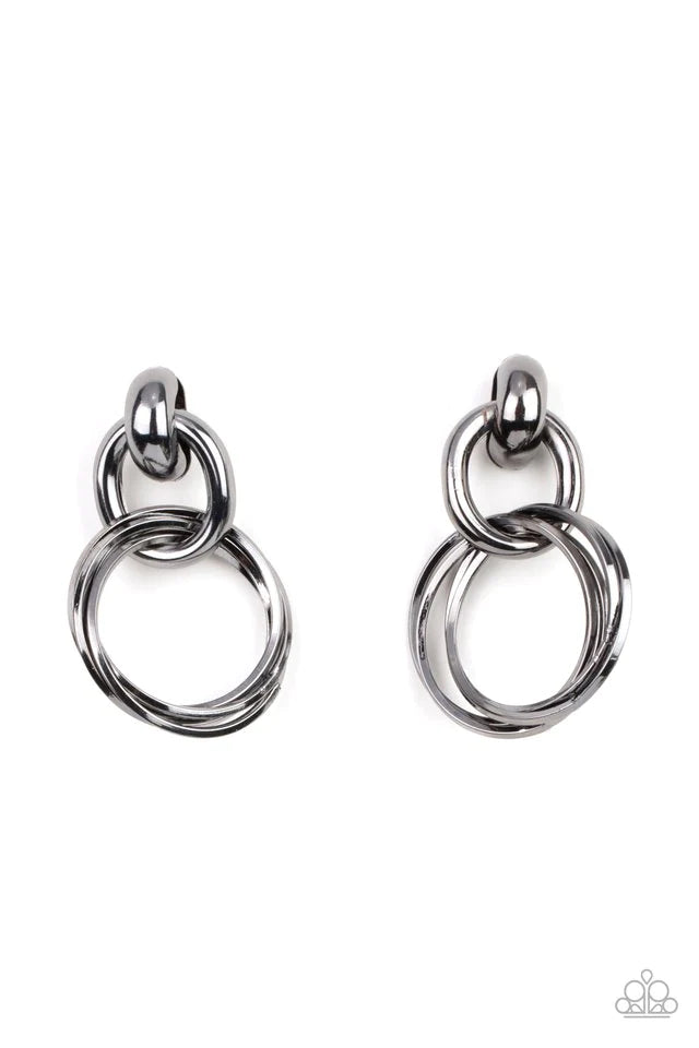 Glistening gunmetal hoops are threaded through a bold gunmetal fitting, adding a timeless twist to the dynamic display. Earring attaches to a standard post fitting.