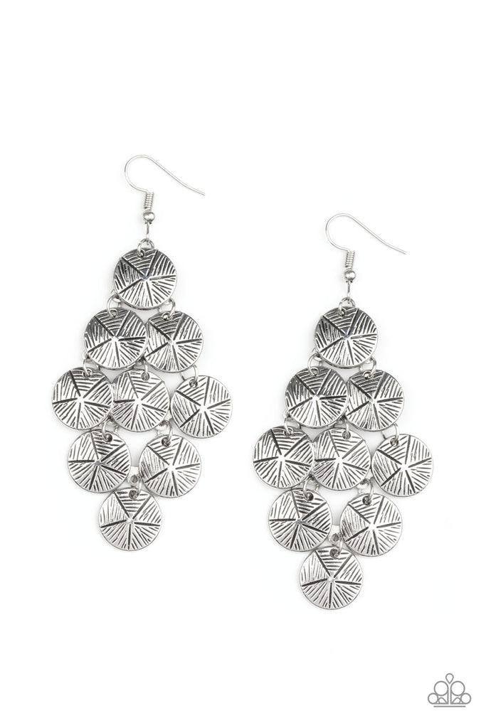 Etched in linear textures, star stamped silver discs cascade from a netted backdrop, creating a noisemaking lure. Earring attaches to a standard fishhook fitting.