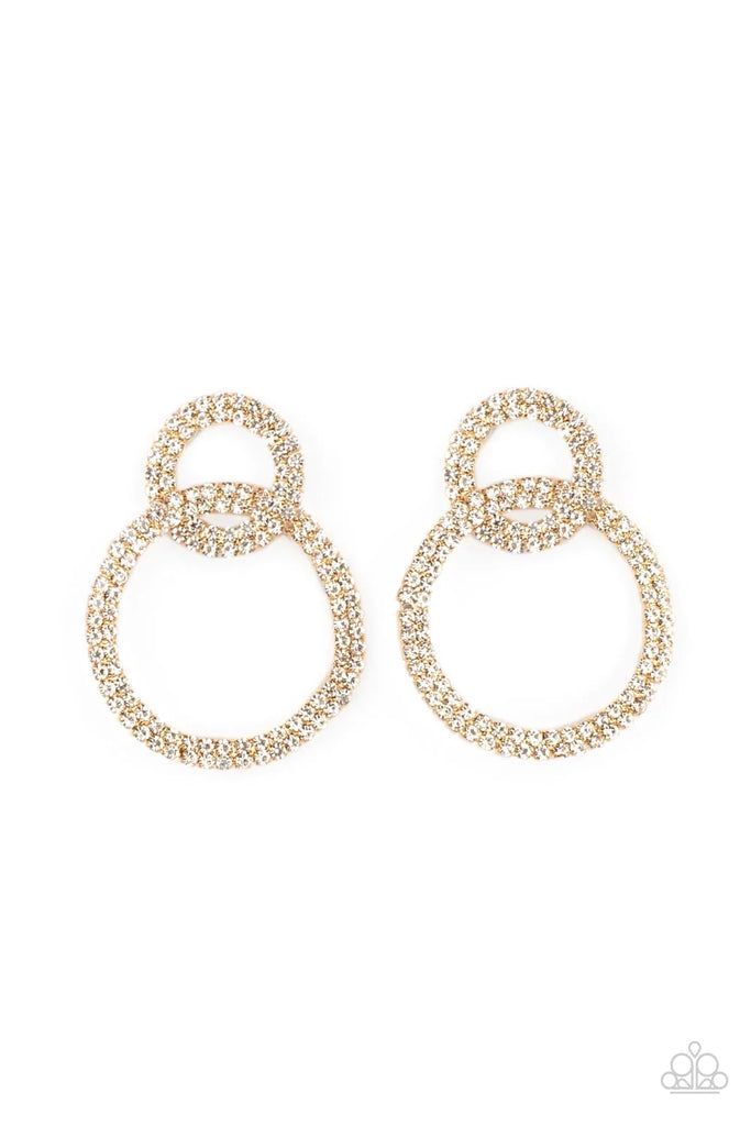 Rows of sparkly white rhinestones encircle into two interconnected hoops, creating a jaw-dropping lure. Earring attaches to a standard post fitting.