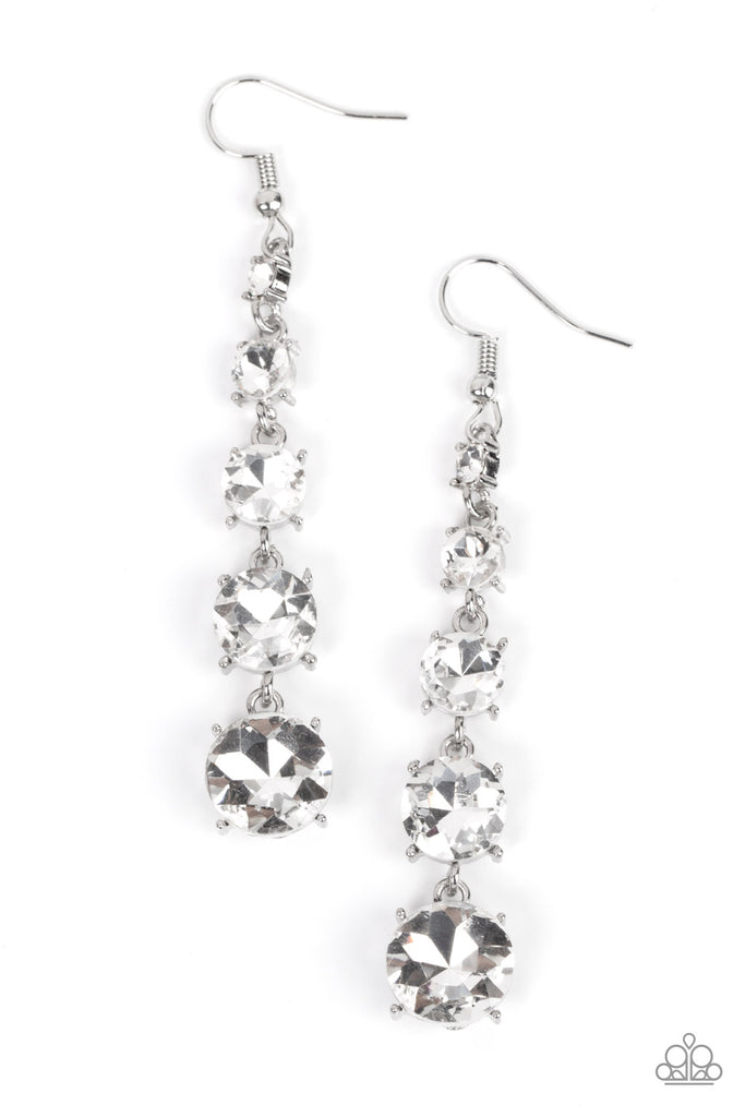 Encased in pronged silver fittings, a dramatic display of glittery white rhinestones gradually increase in size as they trickle from the ear for a timeless look. Earring attaches to a standard fishhook fitting.
