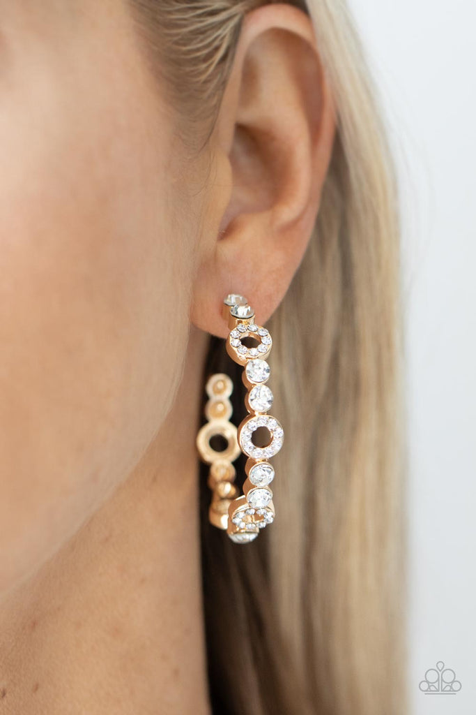 Dainty round gold frames encrusted with sparkling white rhinestones act as show-stopping accents around a gold hoop of white rhinestones culminating in a swoon-worthy finish. Earring attaches to a standard post fitting. Hoop measures approximately 1 1/2" in diameter.
