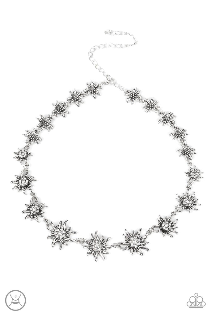 Featuring studded silver or white rhinestone encrusted centers, lifelike silver daisies gradually increase in size as they link around the necklace for a fashionably floral display. Features an adjustable clasp closure.