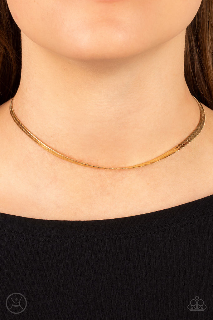 A strand of glistening gold snake chain loops around the neck, resulting in an edgy shimmer. Features an adjustable clasp closure.