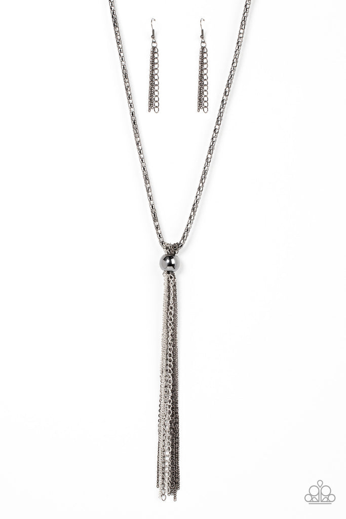 A metallic mashup of silver and gunmetal chains stream out from an oversized gunmetal beaded fitting at the bottom of a chunky gunmetal mesh chain, creating a tantalizing tassel down the chest. Features an adjustable clasp closure.
