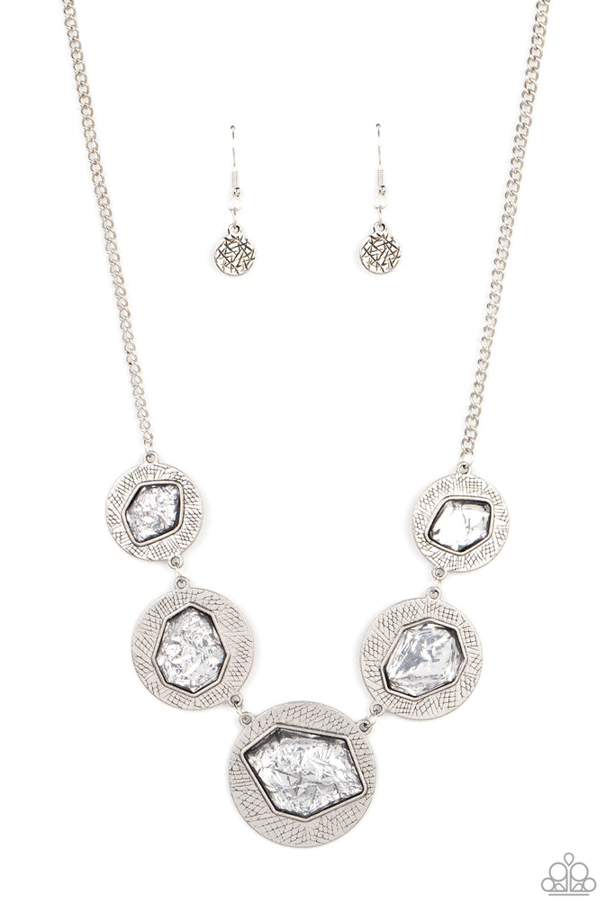 Featuring a refracted shimmer, asymmetrical, glassy silver gems sparkle atop textured silver discs as they delicately link into an edgy statement piece below the collar. Features an adjustable clasp closure.