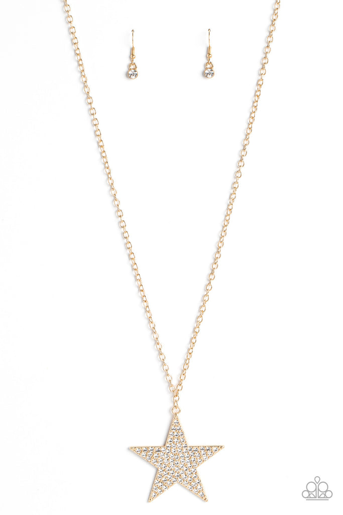 The front of an oversized gold star is encrusted in blinding white rhinestones, resulting in a stellar pendant at the bottom of a lengthened gold chain. Features an adjustable clasp closure.
