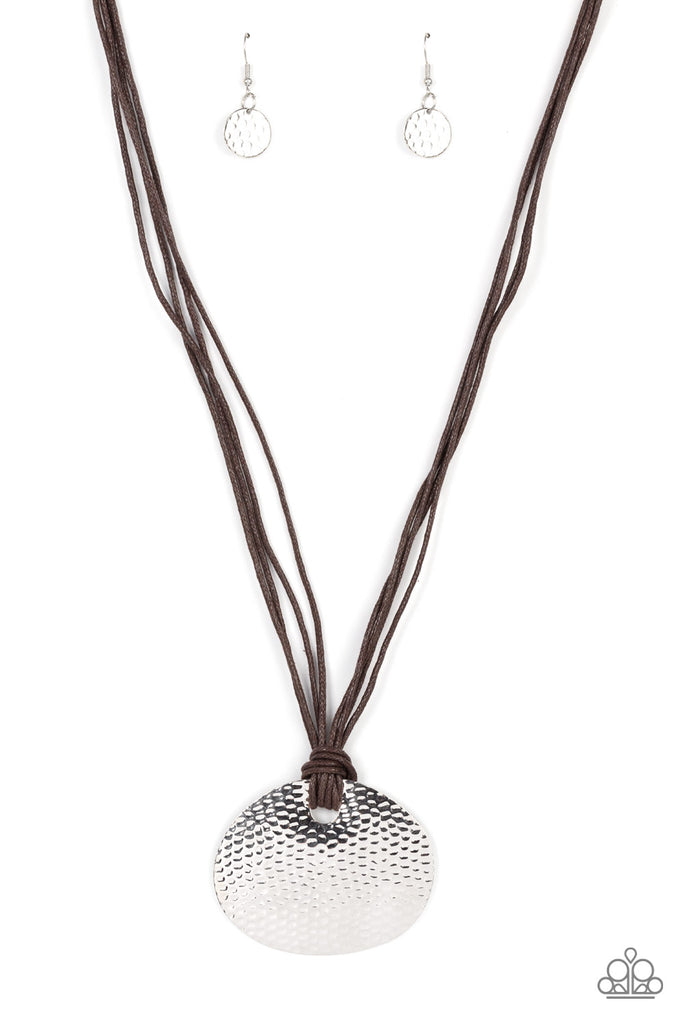 A meticulously hammered silver frame is knotted in place with brown cording, invoking an artisan inspired aesthetic. Features an adjustable clasp closure.