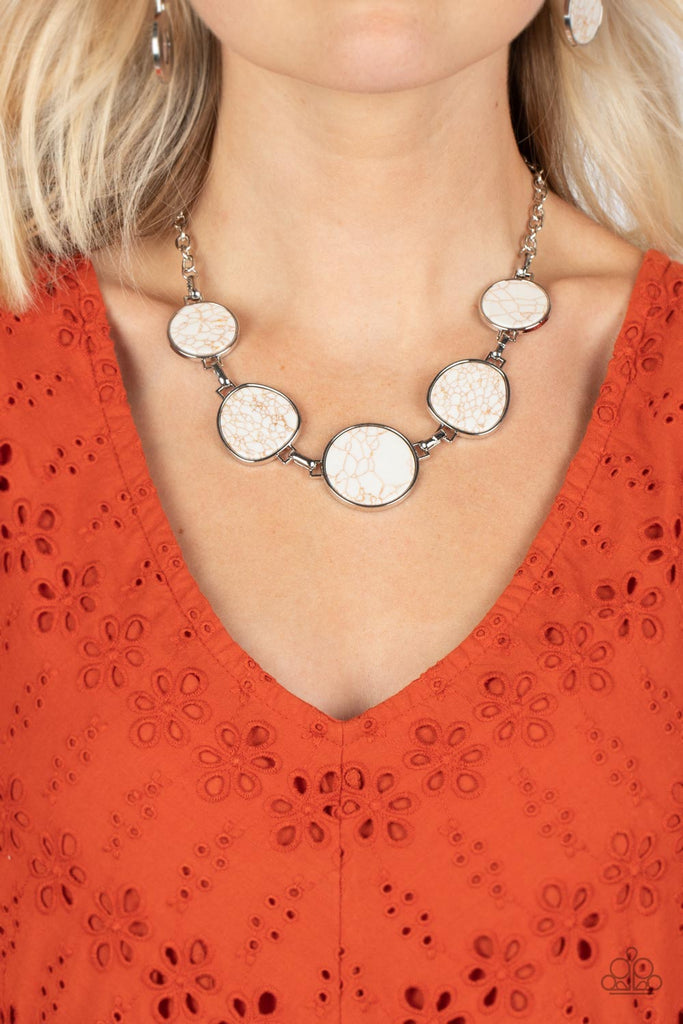 Flat white stones are pressed into silver frames, creating a bold, rustic statement piece. The irregular shape of the stones brings an artisanal touch to the design, as the hinge-like links connect the colorful stones along the collar. Features an adjustable clasp closure. As the stone elements in this piece are natural, some color variation is normal.