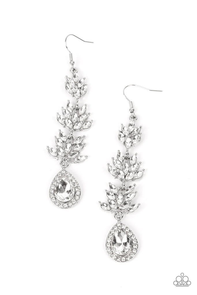 Modeled after water-lilies, marquise-cut reflective white petals form a water-lily shape in three expanding frames. Dangling under the watery shapes, a reflective white teardrop encrusted with white rhinestones ripples for a whimsical finish. Earring attaches to a standard fishhook fitting.